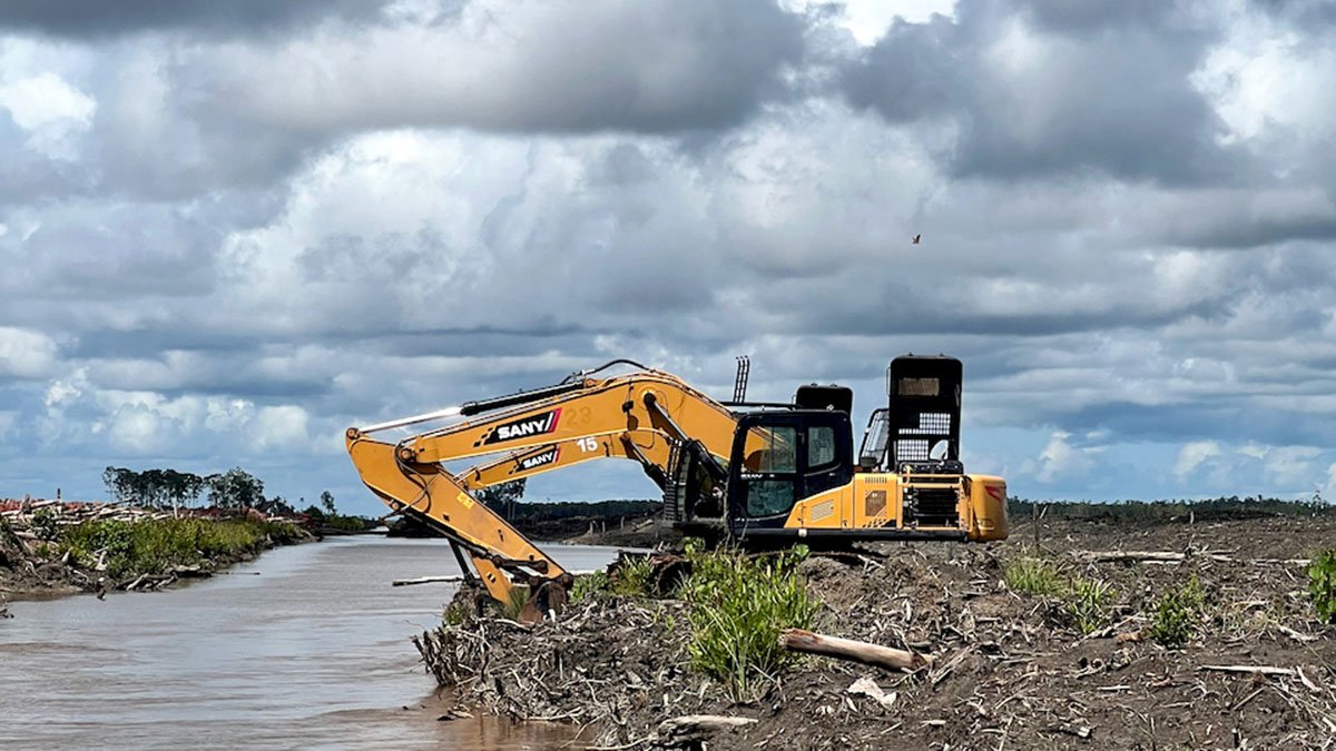 Dua eskavator rusak milik pengusaha tambang Andi Syamsuddin Arsyad berada di tepi jalan khusus swasenbada pangan dan energi, kampung wanam, Distrik Ilwayab, Kabupaten Merauke, Papua Selatan, 1 Desember 2025. Sumber Foto: tempo.co